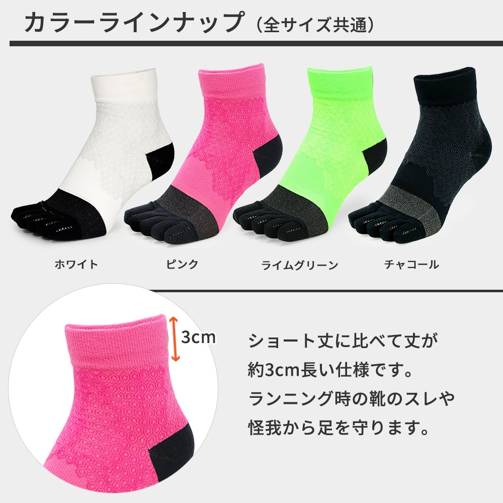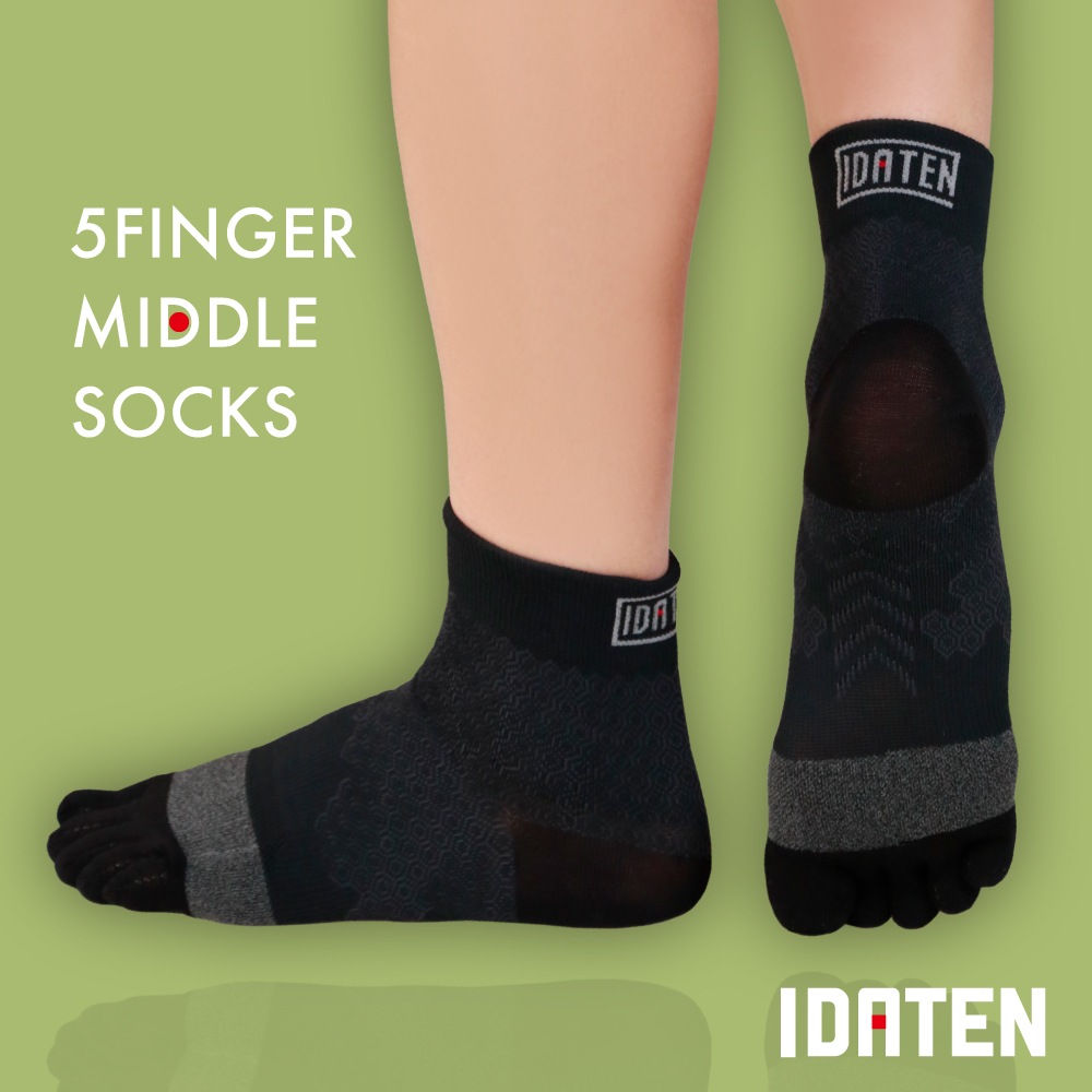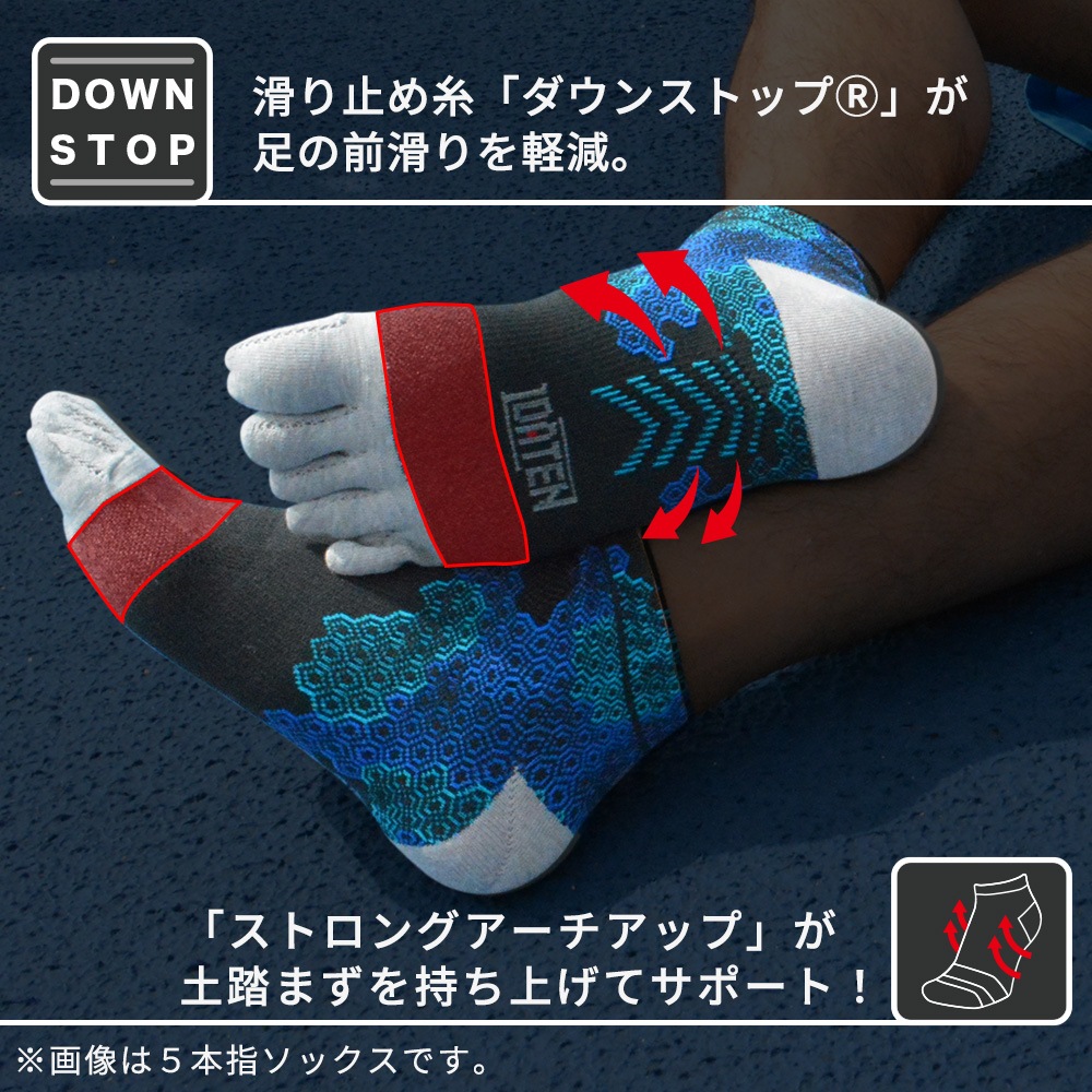 ★5本指仕様のソックスは、足指の掴む力が直に伝わるのでグリップ力が上がり、高パフォーマンスが期待できます。
